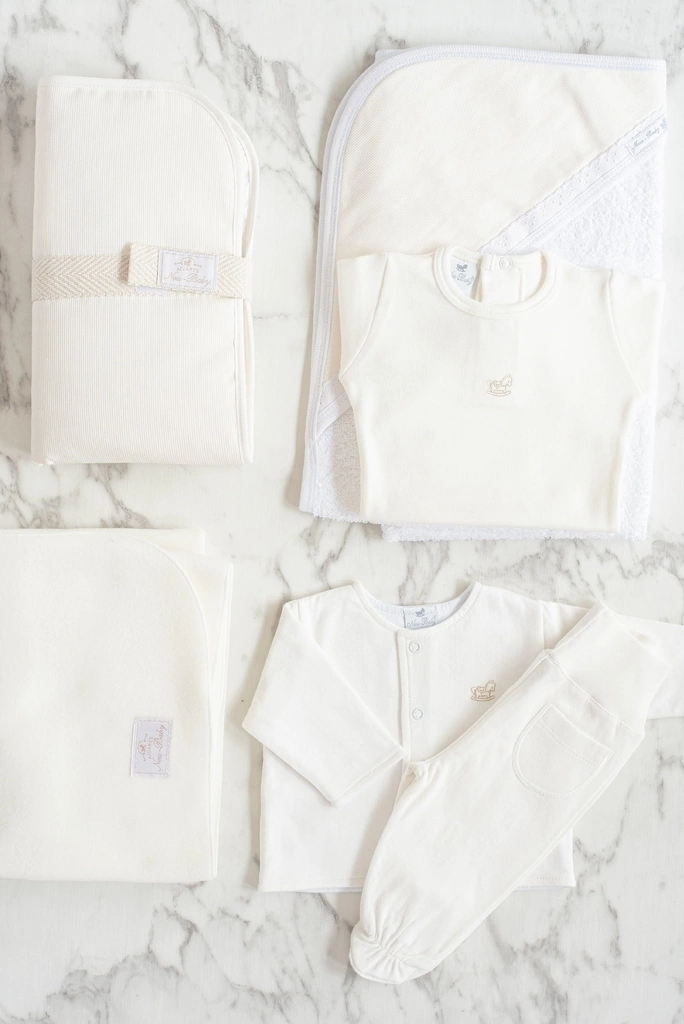 Regalo de nacimiento original que combina accesorios y ropita de bebé. La manta de polar es super suavecita y el conjuntito muy delicado.
