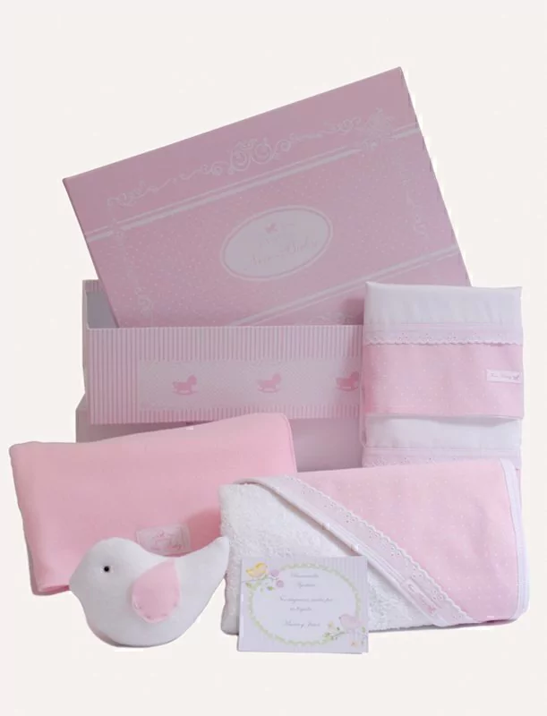 Regalo de nacimiento con hermosos artículos de blanquería y un sonajero divino