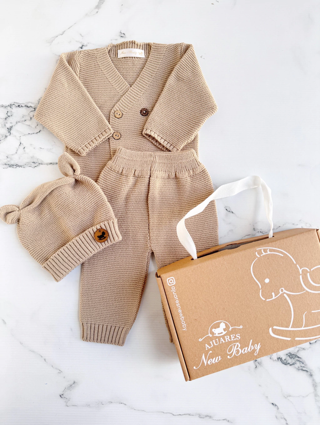 El Conjunto Tejido es presentado envuelto en papel de seda dentro de la Cajita Kraft. La presentación del regalo de nacimiento es hermosa!!