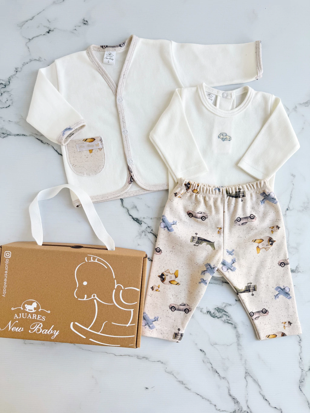 El Conjunto Saco, Pantalón y Body es presentado en Caja Kraft New-Baby (mirala en la última foto) con papel de seda en su interior