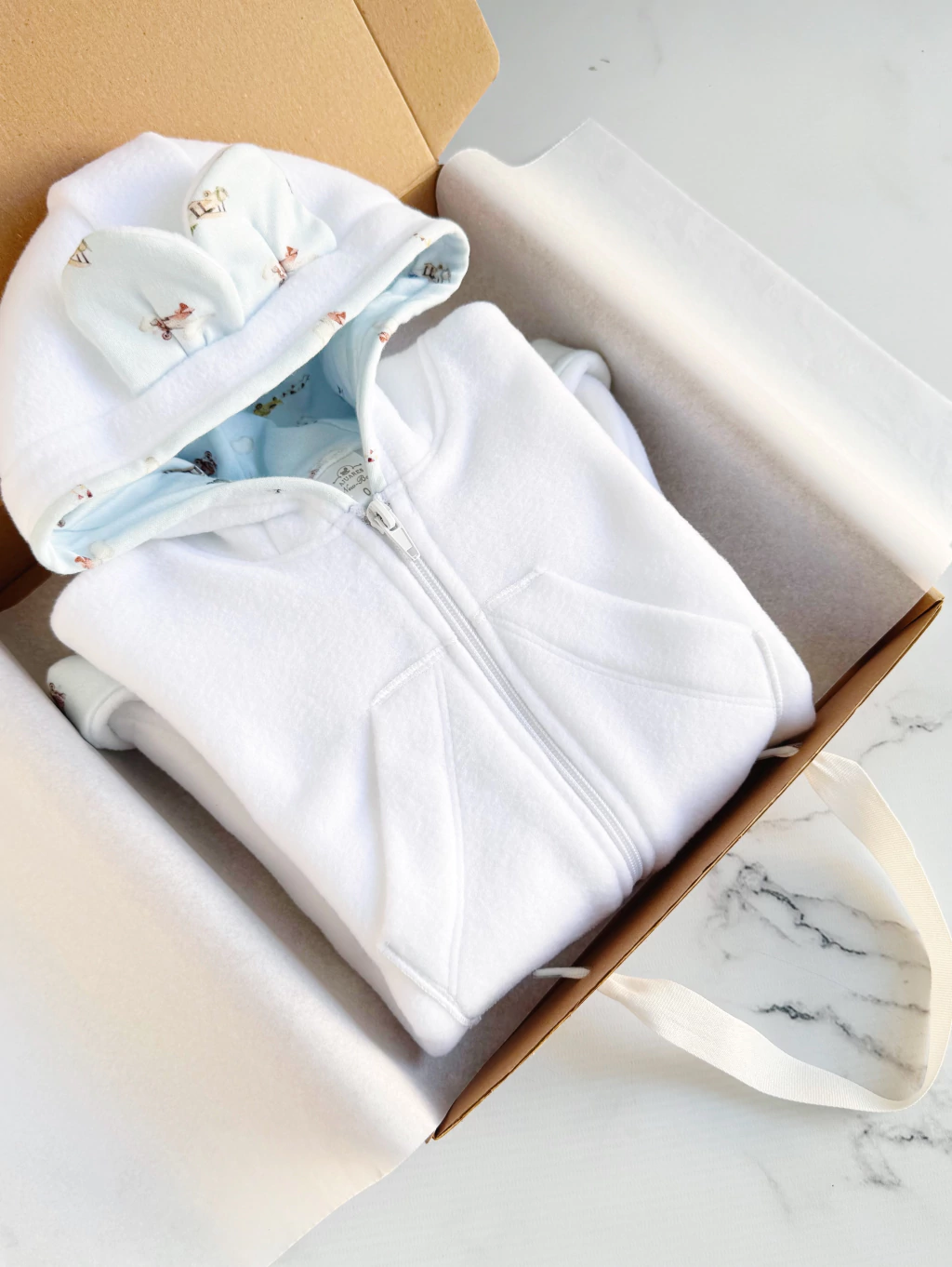 Tiene capucha forrada en puro algodón estampado con orejitas.