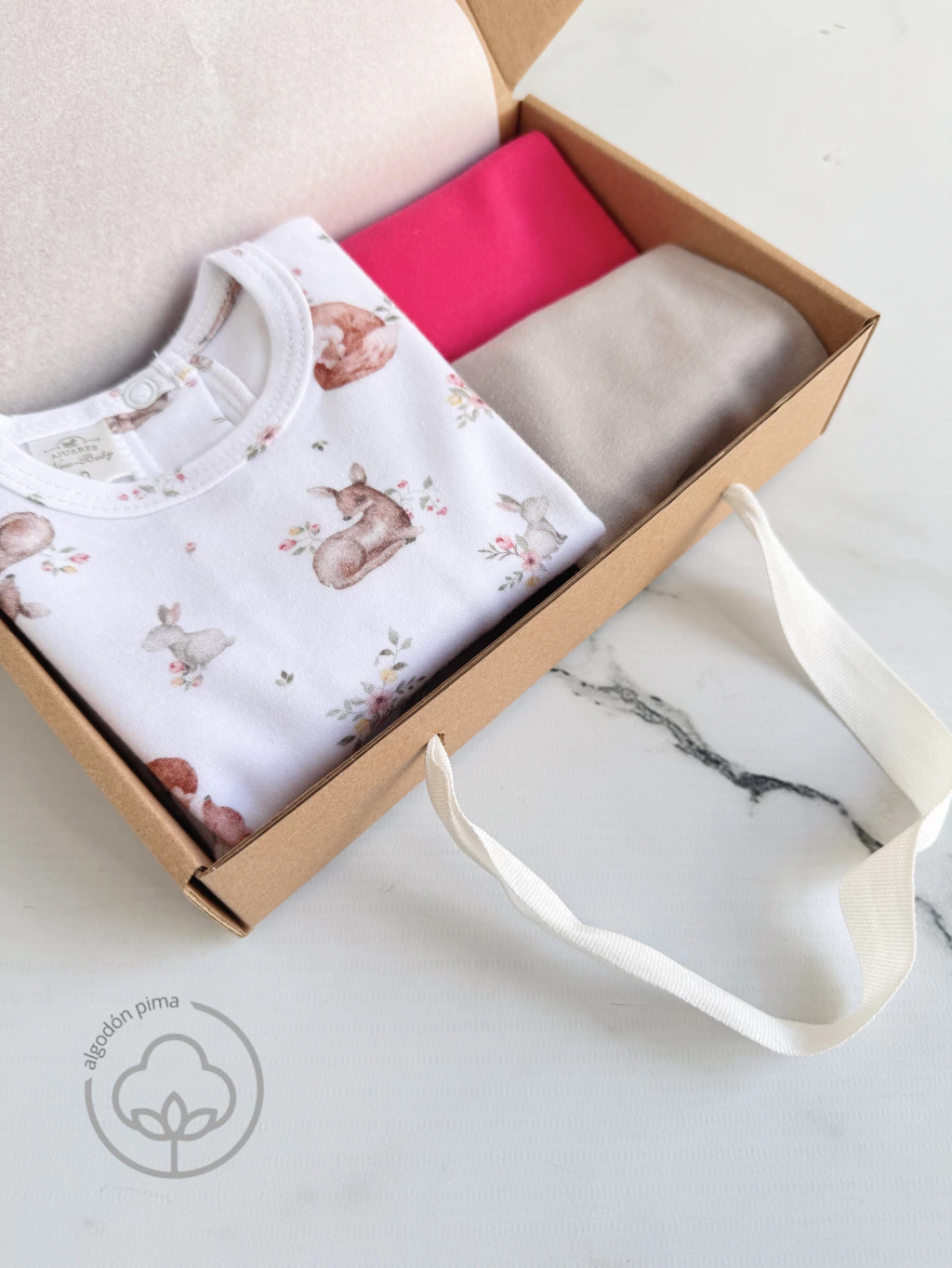 El Pack es presentado en Caja Kraft, envuelto en papel de seda con moño y tarjeta al tono. La presentación del regalo de nacimiento es hermosa!!