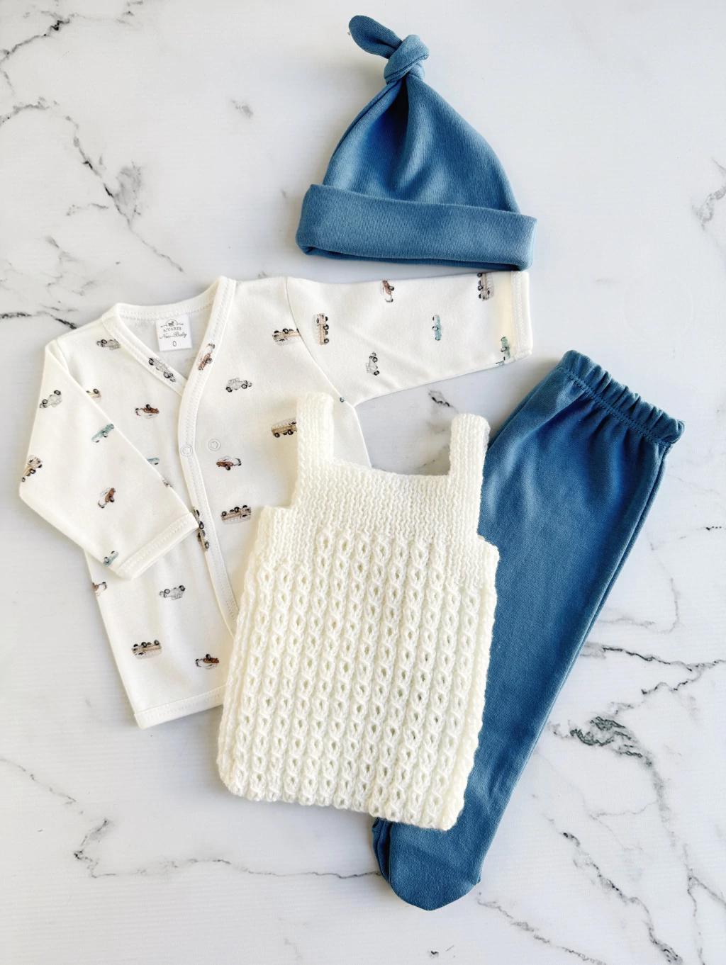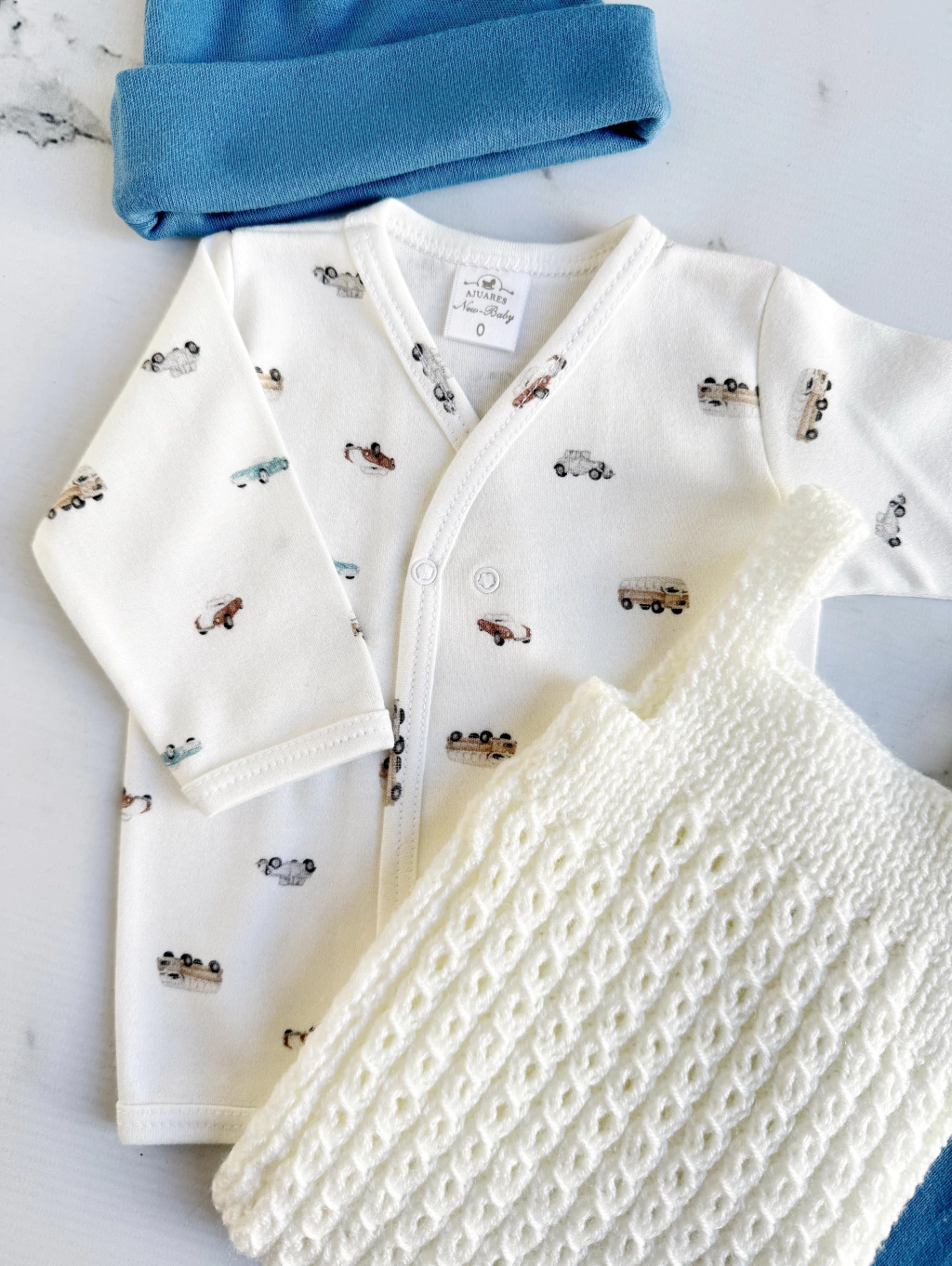Descubrí el Pack de Batita Estampada, Ranita y Gorro, acompañado de un Chalequito tejido a mano de puro algodón, perfecto para mantener abrigado a tu bebé en esos días fríos. Este conjunto es esencial para llevar a la clínica o para los primeros días en casa, asegurando el confort que tu pequeño merece.
