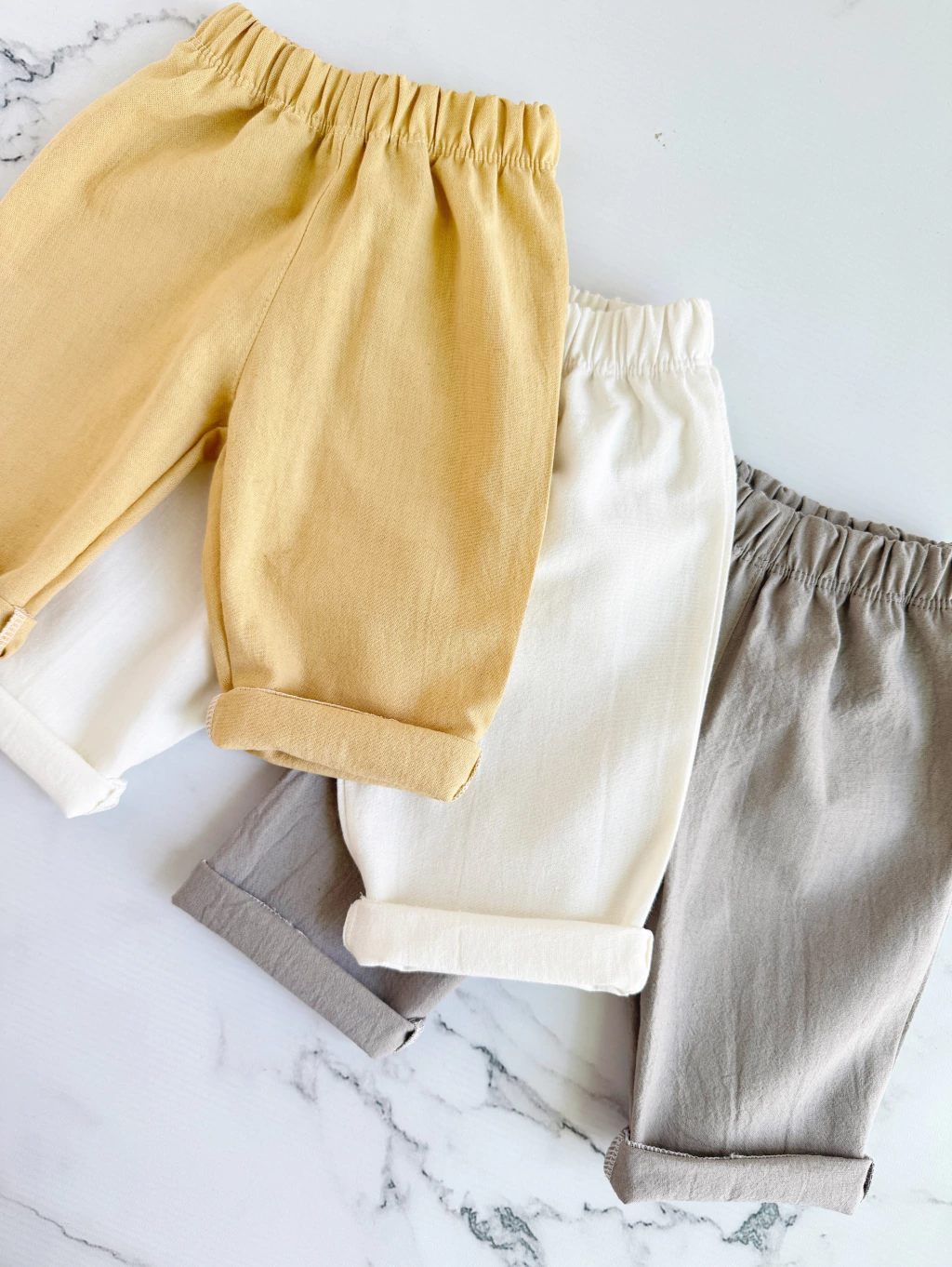 Un básico infaltable para todos los días. Este pack incluye tres pantalones confeccionados en tusor liviano, suave y fresco, ideales para acompañar al bebé en cualquier momento del día.